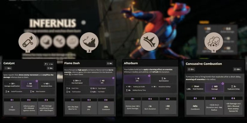 Infernus has the ability of passive Afterburn that adds burn damage to every bullet making it important through all stages of the game, as it allows Afterburn to scale with Spirit increasing Infernus’s overall damage.