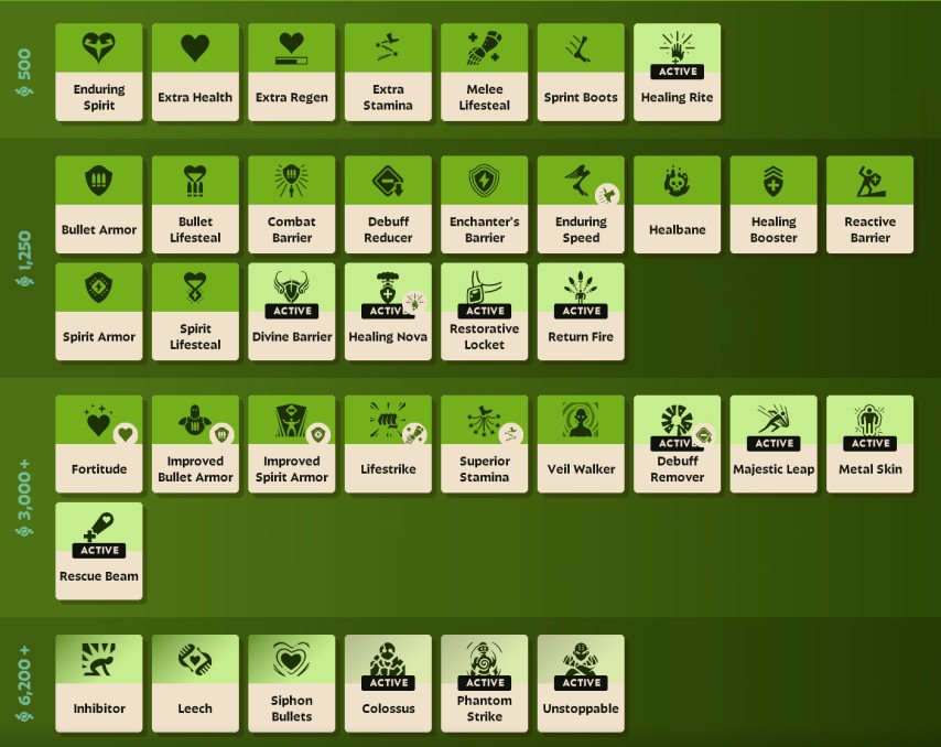 Example Bonuses: Extra health, bullet and spirit shields, enhanced regeneration.