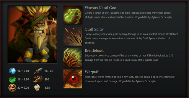 Bristleback has an astounding set of tools which turn him into an almost unkillable monster while making sure everyone that dares oppose him finds an unbearable consequence. His most important tool, “Quill Spray” serves to deal damage to all enemies who get within an area surrounding him an area ensuring that the more enemies get hit, the more damage they do. “Viscous Nasal Goo” on the other hand lowers the armor on enemies and slows them down, giving Bristleback the opportunity to go after fleeing opponents or even start the fight if he so wishes to. In its simplest form, picking as passive skill “Bristleback” will allow an attacker to reduce damage done to sides and back enabling them to take a heavy amount of damage in accordance with their position which makes them an incredible front liner. Last but not least is “Warpath”.