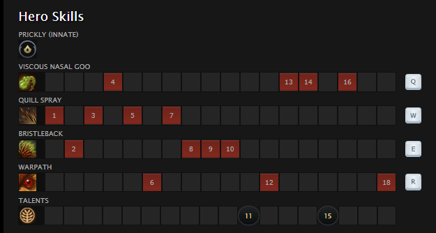 Quill Spray should be the first skill to be leveled up as it helps back in dealing with a group of assailants and also harassing them more. A person after making it past lane should focus on developing Bristleback proving to be even more durable allowing the player to get significantly tanked and to retaliate by performing free Quill Spins.