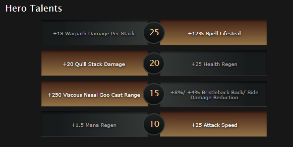 Level 20: +20 Quill Spray Damage. The increase of the damage dealt by Quill Spray will make it more possible for Bristleback to deal more damage with Quill Spray and as such be more effective in long fights.