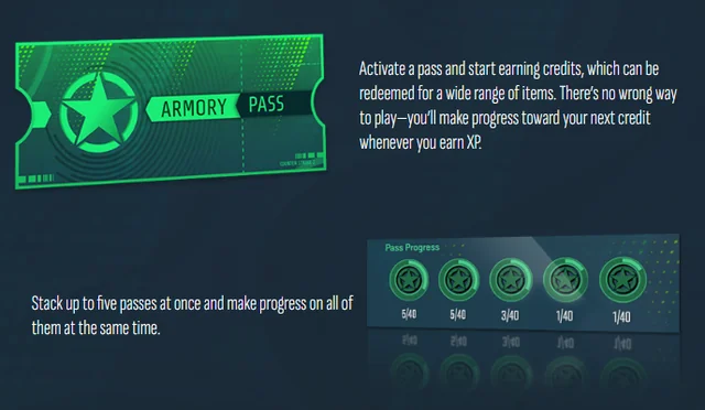 If you activate multiple Armory Passes (up to five), the same amount of experience will be credited to each one. In other words, if you earn 1,000 XP in a match, you’ll gain progress toward each active Pass.
