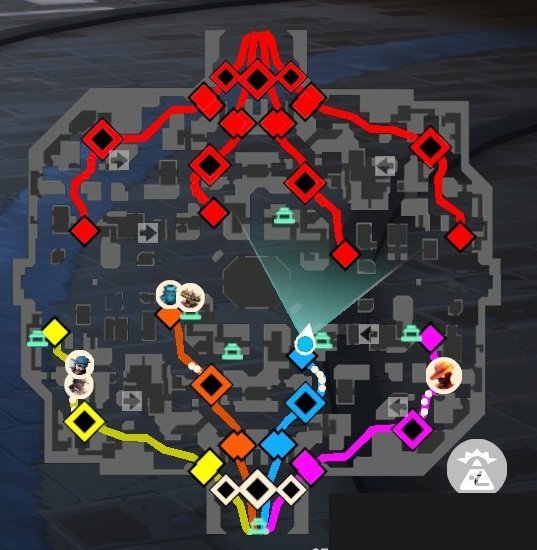 The map in Deadlock consists of 4 lanes which include Yellow lane, Orange lane, Blue lane, and Purple lane. Each lane has a zip line that is usable to fast travel but the control of that lane must belong to your team, otherwise you cannot use it. the game is split into 2 duo lanes and 2 solo lanes with respect to two pair of players and in the first 10 mins if a player is close to his teammate one of the players full value soul bonus is awarded for minion kills.