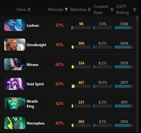 Leshrac has dropped from 58% to 37% among pro players. This statistic is taken from the Dota2ProTracker website.