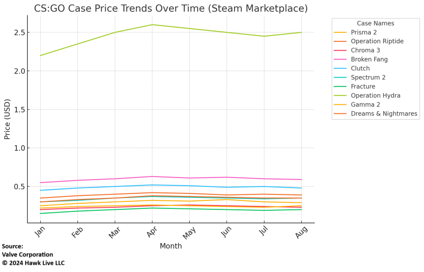 Case | Price on Steam Marketplace (USD) | Number of Cases Sold Recently | Price of the Most Expensive Skin in the Case (USD) | Average Skin Price in the Case (USD) |