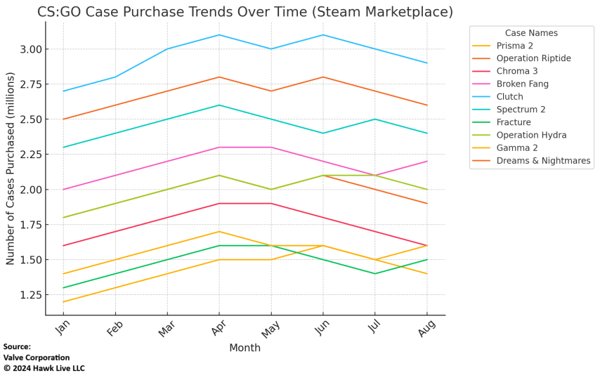 In 2023-2024, the market of skins from cases has reached record levels. According to analysts' estimates, the total revenue from trading skins and cases in CS2 is more than $1 billion per year, and more than 30% of all transactions on Steam Marketplace are related to opening cases. Statistics show that about 70% of CS2 players open a case at least once a year, which confirms their popularity among a wide range of gamers.