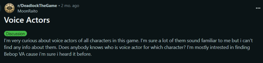 Deadlock уже получил признание за атмосферу и динамику, а некоторые сообщества даже организовали турниры с денежными призами. Несмотря на внимание, уделяемое игре, состав актёров озвучки остается в тени, создавая почву для домыслов среди поклонников. Один из пользователей Reddit, под ником u/MoonRaito, создал ветку на официальном сабреддите Deadlock, где фанаты делятся своими догадками о том, кто может стоять за голосами персонажей.