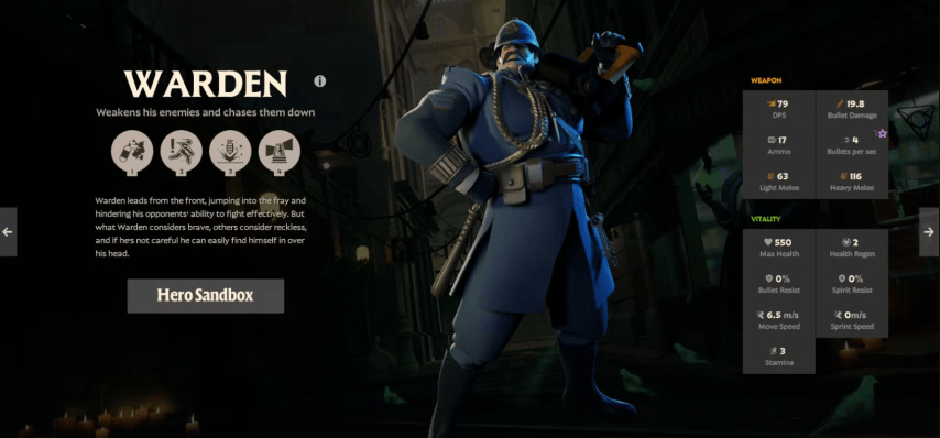Warden - настоящий фронтовик, способности которого сосредоточены на уроне и впечатляющей живучести. Сила воли дает ему щит и ускоряет передвижение, что позволяет ему быть более активным на карте. Его фляга делает врагов слабее, что позволяет легко побеждать их в боях. Связующее слово делает врагов незащищенными и очень выгодно используется вместе с другими способностями. Ультимейт Warden'а The Last Stand наносит урон всем ближайшим врагам и позволяет ему лечиться, что делает его мощным присутствием на поле боя.