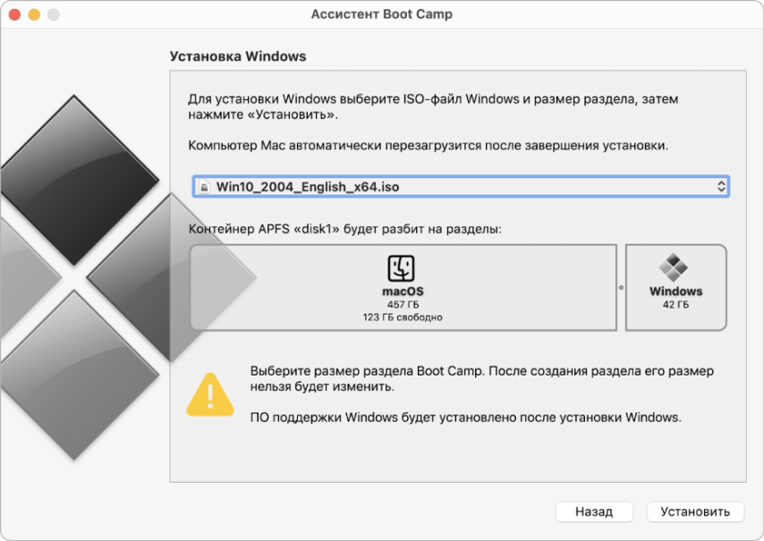 Перед началом установки отключите все ненужные внешние устройства. Следуйте пошаговым инструкциям установщика Windows. После завершения установки ваш Mac автоматически загрузится в Windows.