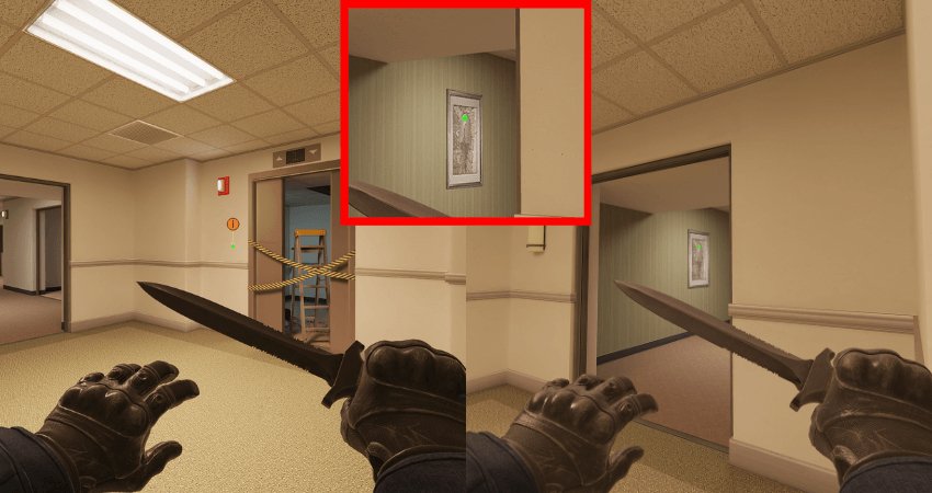 Прицельтесь в угол стены, как показано на изображении ниже, выровняв прицел с верхней частью дверного проема.