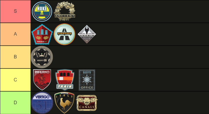 B | Dust 2 | Классика с простыми макетами, но немного устаревшая для соревновательного игрового процесса. |